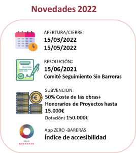 Al programa de ayudas “Sin Barreras”, que cuenta con una dotación de 150.000€, podrán optar las comunidades de vecinos situadas en la Comunidad de Madrid y Barcelona y su área metropolitana, donde resida, como mínimo, una persona con movilidad reducida -personas con discapacidad con afectación a la movilidad o personas de más de 75 años-. La cuantía de las ayudas ascenderá al 50% de la suma del presupuesto para la ejecución de la obra de accesibilidad y los honorarios técnicos para la redacción del proyecto y dirección de obra, hasta un máximo de 15.000€ por comunidad.