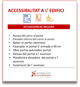 Barcelona, 20 de maig de 2023–   El 87% dels edificis d’habitatges catalans necessitaria realitzar actuacions d’eliminació de barreres arquitectòniques per a millorar la seva accessibilitat, aquest fet suposa un cost mitjà per llar de 1.361€, d’acord amb el càlcul realitzat per la Fundació Mutua de Propietarios a l’informe “Accessibilitat a l’edifici: despesa o inversió?”.