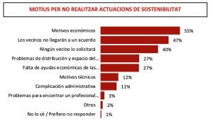La falta d’acord entre veïns (55%) i els motius econòmics (47%) són les principals raons exposades. En aquest últim punt, la barrera dels 2.000 euros per llar és el punt d’inflexió per a considerar probable o no probable dur a terme les millores