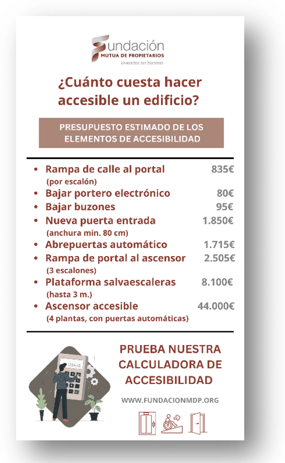 Madrid, 12 de junio de 2023– La Fundación Mutua de Propietarios ha presentado hoy una herramienta online única en el mercado que calcula el coste de hacer accesible tu edificio, (https://www.fundacionmdp.org/calculadora-de-accesibilidad/) presupuestando las obras necesarias para eliminación de las distintas barreras arquitectónicas, tales como escalones en el portal, telefonillos elevados o puertas pesadas.