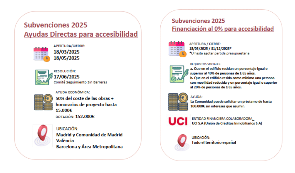 Las comunidades de propietarios solo podrán acceder a una de las dos subvenciones, debiendo evaluar cuál se adapta mejor a los requisitos de las obras de eliminación de barreras arquitectónicas en las zonas comunes del edificio, para hacer accesible el itinerario de la calle a las viviendas.
