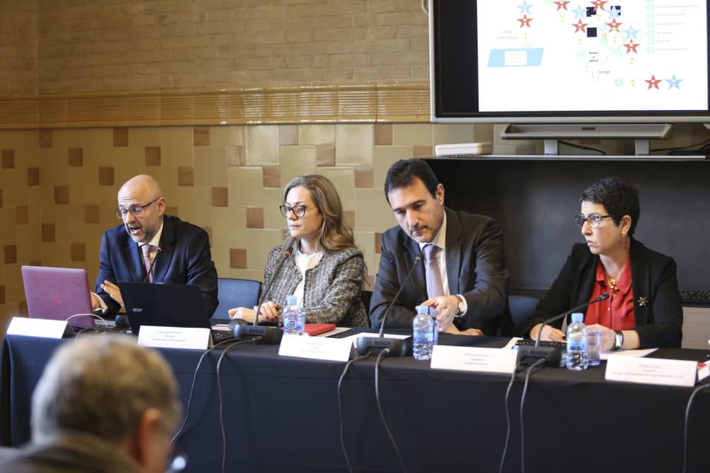 De izquierda a derecha, D. Enrique Vendrell, Presidente del Colegio de Administradores de Fincas de Barcelona-Lérida, Dña. Montserrat Pallares, Presidenta COCEMFE Barcelona, D. Miquel Perdiguer, Presidente Fundación Mutua de Propietarios, Dña. Laura López, Directora Fundación Mutua de Propietarios y D. Sergio Nasarre, Director de la Cátedra UNESCO a la vivienda de la URV.