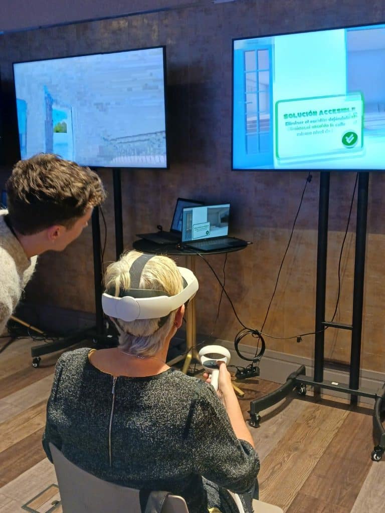 A través de unas gafas de realidad virtual, la experiencia consiste en realizar un itinerario desde el portal hasta la puerta de la vivienda observando las diferentes barreras arquitectónicas con las que se puede encontrar una persona con movilidad reducida, así como las soluciones para eliminarlas.
